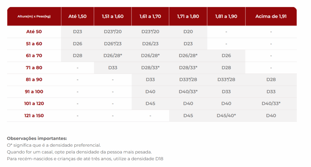 - D50: espuma de alta densidade, recomendada principalmente para pacientes acima de 100 kg, com mobilidade reduzida ou que permanecem deitados por mais de 8 horas seguidas.